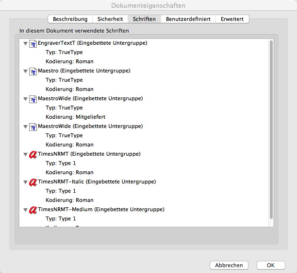 Auch wenn ich nur eine ungefähre Vorstellung davon habe, wie denn gekackt gedruckte Haltebögen aussehen mögen, so hatte ich bisher noch keine Probleme damit, einfach aus dem Druckdialog hergestellte PDF an die Druckerei weiterzugeben. Normalerweise sind die Schriften immer darin eingebettet, das kannst Du im Acrobat oder Adobe Reader überprüfen wie auf dem Bildschirmfoto zu sehen. Hast Du die PDF selbst mal dem Laserdrucker gedruckt? Wenn sonst keine Schriftauffälligkeiten wie Ersatz durch Courier o.ä. zu sehen sind, liegt es wohl nicht an der Schrifteneinbettung, sondern eher an der Auflösung. Deiner Beschreibung nach stellst Du eine Postscriptdatei her und daraus mit dem Acrobat Distiller die PDF? Im Prinzip dasselbe läuft über den Druckdialog auch im Hintergrund ab.