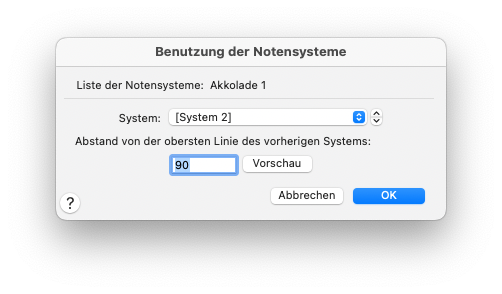 Abstände der Notensysteme können im Notensystem-Menue (erscheint bei Anwahl des NOTENSYSTEM-Werkzeugs) editiert werden: