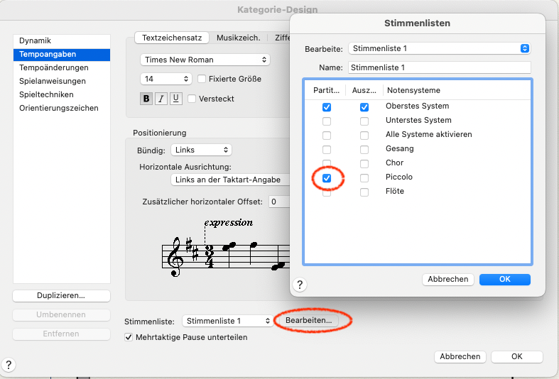 - die Stimmenliste 1 bearbeiten oder eine neue Stimmenliste wählen: der Haken bei "Piccolo" muss weg. Und wenn vorhanden alle anderen auch, so dass bei Partitur nur "Oberstes System" angewählt ist.
