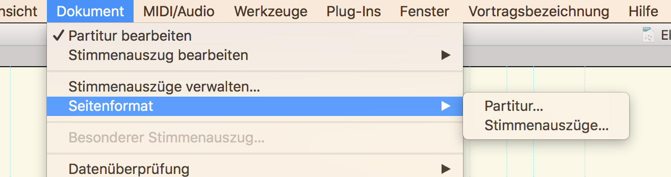 Erst mal sollte die Partitur so eingerichtet sein, dass beim Erstellen der Stimmenauszüge möglichst viel schon richtig ist. Bei einer Menge von (Blasorchester-typisch ~20 Stimmen) lohnen sich gewissenhafte und ausführliche Voreinstellungen. Vor allem im Fenster Dokument->Seitenformat->Stimmenauszüge, insbesondere die Skalierung und die Positionierung der Akkoladen.