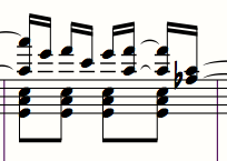 es sieht nach „Stimme 1/Stimme 2“. Schau' bitte in der Hilfe bei Mehrstimmigkeit (Polyphonie). Dies lässt sich schlecht auf einer Ebene "entwirren".