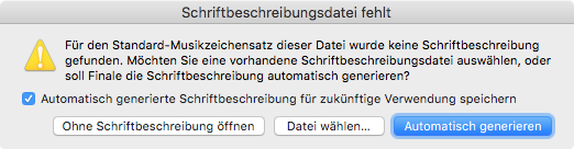 Jeder Musik-Font benötigt eine eigene .fan-Datei. Wenn Finale für den im "Dokument"-Menü festgelegten Standard-Musikfont keine Datei gefunden wird, fragt das Programm nach.