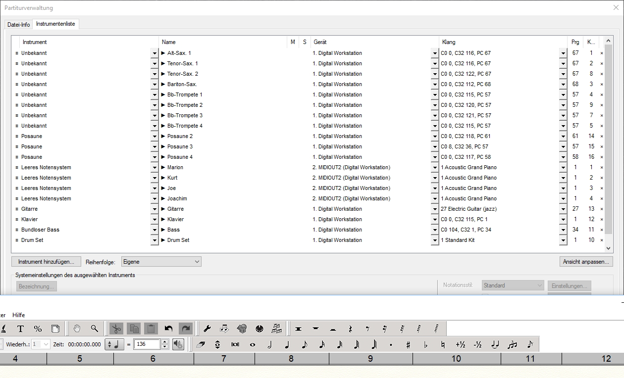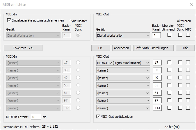 zurzeit schreibe ich mehrer Arrangements für Bigband und Jazzchor. Für die Wiedergabe benötige ich bis zu 28 MIDI-Kanäle. Leider gelingt es mir nur 17 Kanäle zur Wiedergabe zu bewegen (1-16 auf dem ersten, 17 auf dem zweiten Instrument). Wer kann mir helfen?