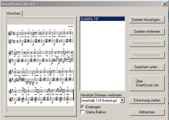 Dann klicke ich in Printmusik auf das Scanner-Symbol und klicke auf "Dateien hinzufügen". Nun noch in das Verzeichnis mit der TIF-Datei gehen und diese auswählen. Die Datei erscheint im im Fenster und kann dann angewählt werden (eine Vorschau des Scans wird nun auch links angezeigt). Dann Erkennung starten. Siehe hierzu auch das angehängte Bild
