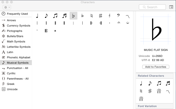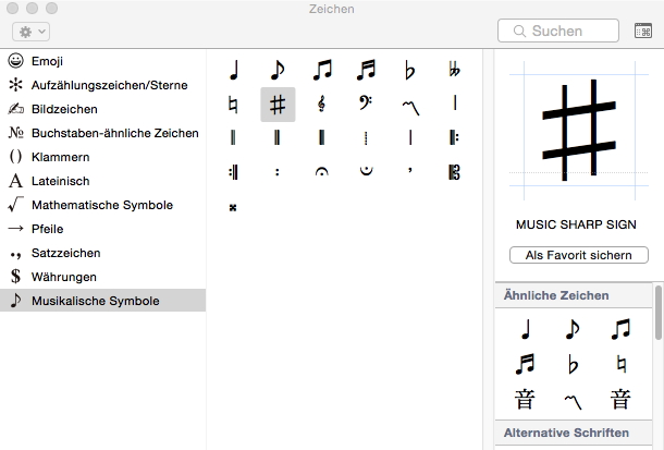 Also ganz so einfach ist es nun auch wieder nicht: Die Zeichenübersicht zeigt lediglich, welche Zeichen es generell gibt, die aber deshalb noch lange nicht in allen Zeichensätzen vorkommen. Daß für Notensatz die wenigsten zu gebrauchen sind, sieht man schon am Kreuz auf dem Bildschirmfoto.
